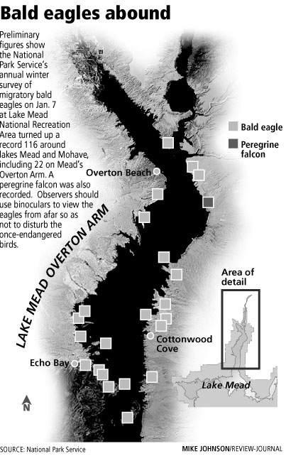 On the survey route for Lake Mead's Overton Arm -- one of eight routes on the lakes combed by teams of biologists -- the dawn-to-dusk tally was 22 bald eagles and one peregrine falcon.