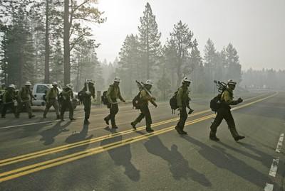 They were trying to keep the wildfire from consuming more buildings near the small town of Meyers, where it started, and from reaching several densely populated subdivisions near where one flank of the blaze jumped a containment line.