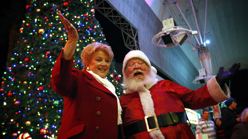 Las Vegas Mayor Carolyn Goodman and Derek Stevens, majority owner of The D Las Vegas hotel and casino officially "flipped the switch" at the ceremonial lighting of the official Las Vegas Christmas tree on the Fremont Street Experience in downtown Las Vegas, Monday, Dec. 10, 2012. The lighting of the 50-foot tree was accompanied by a performance of holiday songs from Candy and the Canes