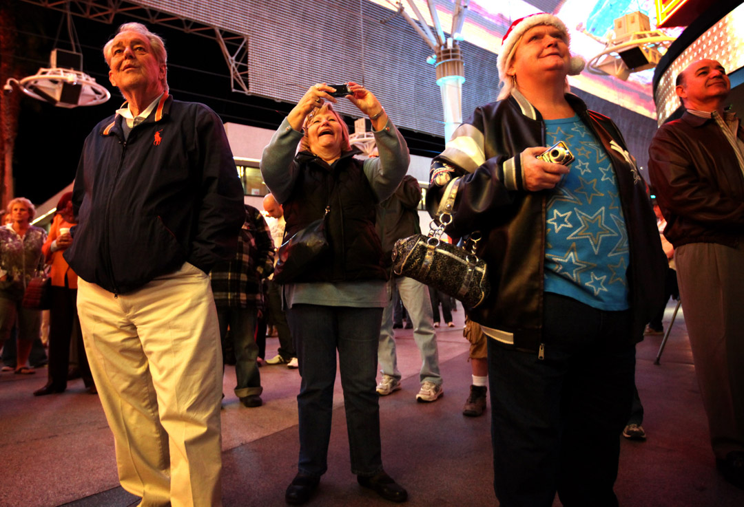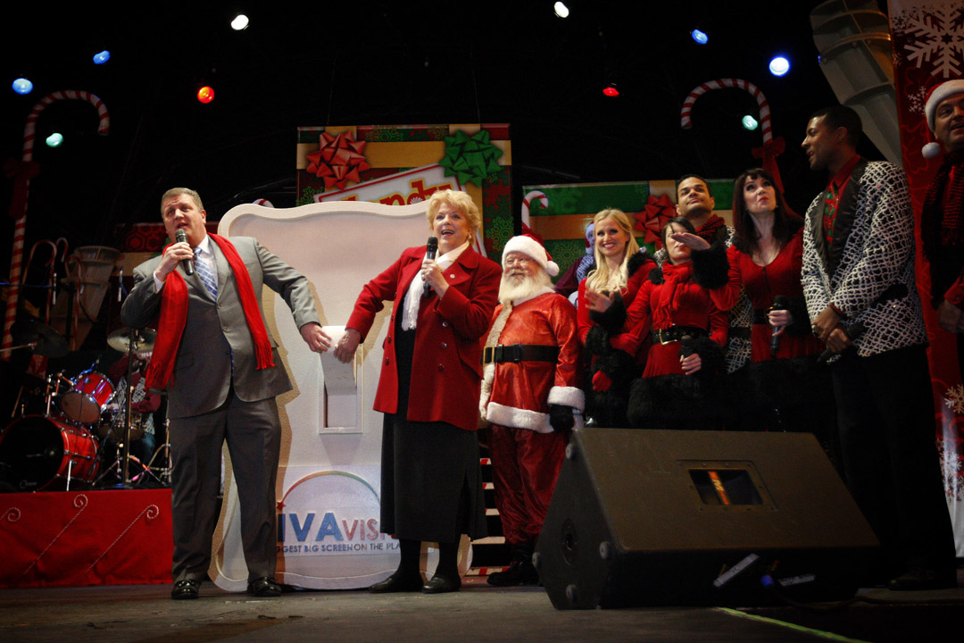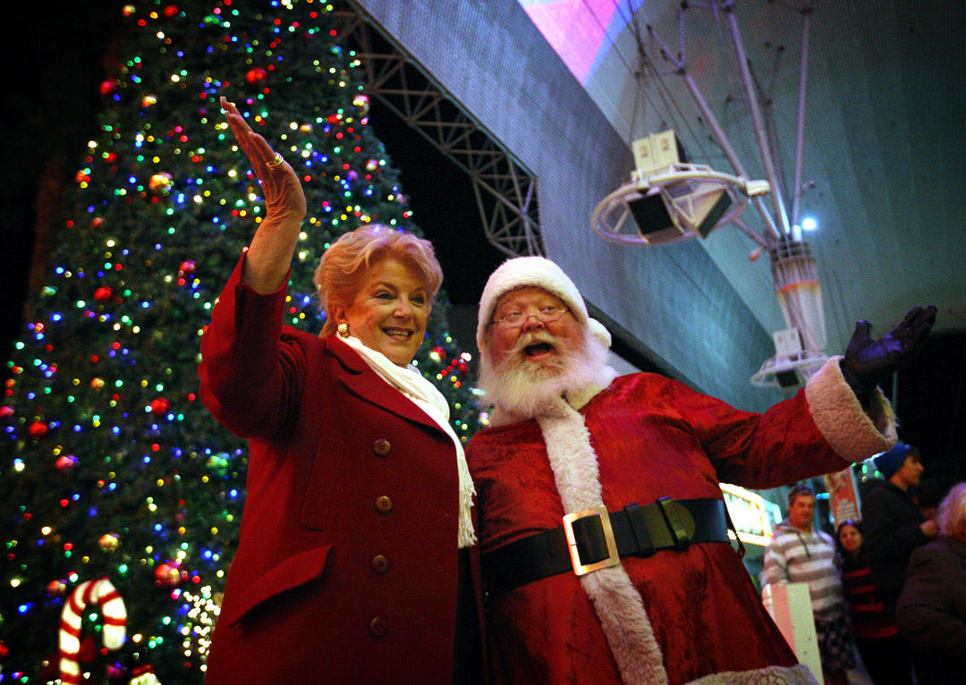 Las Vegas Mayor Carolyn Goodman and Derek Stevens, majority owner of The D Las Vegas hotel and casino officially "flipped the switch" at the ceremonial lighting of the official Las Vegas Christmas tree on the Fremont Street Experience in downtown Las Vegas, Monday, Dec. 10, 2012. The lighting of the 50-foot tree was accompanied by a performance of holiday songs from Candy and the Canes