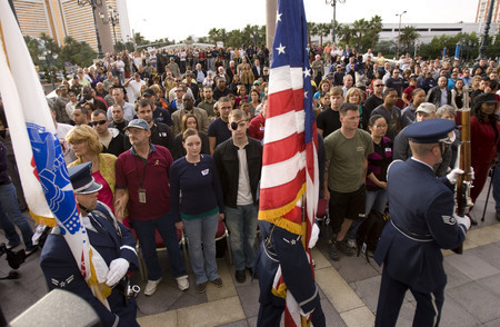 After a flag salute and the singing of the national anthem, Sen. John Ensign, R-Nev., addressed the wounded warriors and their guests under an overcast afternoon sky in front of The Venetian.