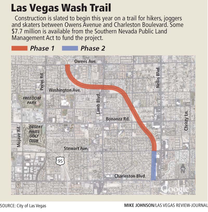 A 2.6-mile segment of a recreational trail along Las Vegas Wash that had been planned for construction last year instead was stalled by approvals from various agencies that have a stake in the wash, a city public works official said.