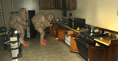 Dressed in hazardous materials suits that looked like they were made out of camping tarps, the soldiers strapped on heavy, self-contained breathing apparatus and carried detection equipment and communications devices into a hotel suite.