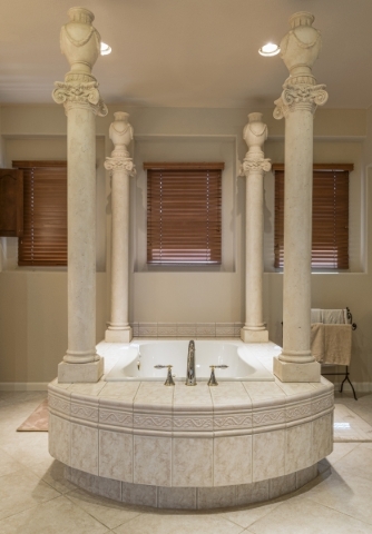 Two guest bedrooms are downstairs, and another bedroom and master bedroom are upstairs. There is also an approximately 700-square-foot casita accessible from inside the courtyard entrance, with lush, mature desert landscaping providing a buffer against the hardscape. The master bedroom includes a lounge area and bedroom divided by a dual-sided fireplace. French doors open out to a balcony overlooking the pool and golf course, with sweeping views of The Strip. The master bath is expansive, with a center seated spa tub with Grecian style columns bordering it, glass-block enclosed shower stall, and his and hers closets.