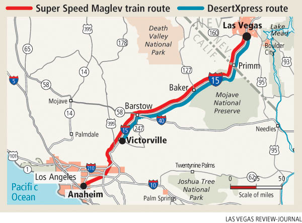 Officials with the maglev project, a private and public partnership, say they can start construction as soon as 2011, with completion in 2016. The maglev would travel at 300 mph and connect passengers from Anaheim to Las Vegas in 87 minutes at a cost of $55 a fare.