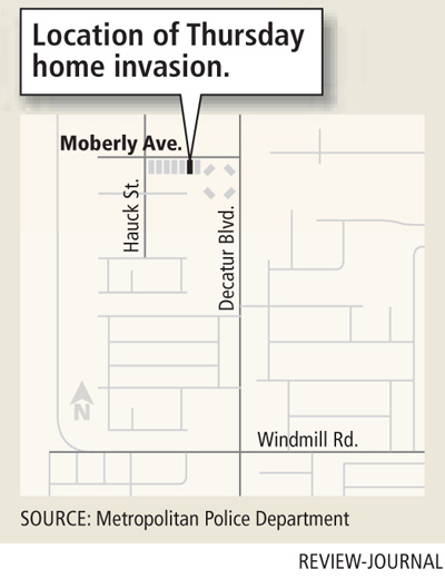 Police said the three suspects entered the house at 4983 W. Moberly Ave., near Warm Springs Road and Decatur Boulevard, about 10 p.m. demanding drugs and money from the people inside.