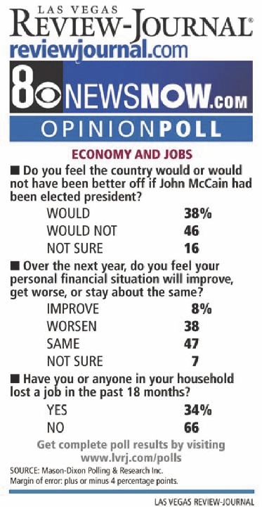 In a poll taken for the Las Vegas Review-Journal and 8NewsNow, voters reacted to the state's financial crisis: One in three households has been touched by record unemployment and less than half believe their financial situation will remain the same over the next year.