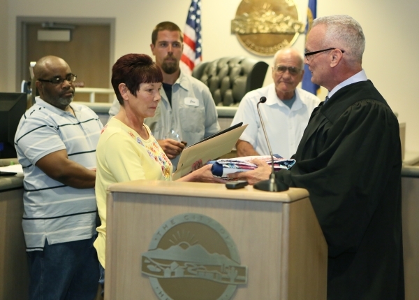 Judge Mark Stevens, right, presents U.S. Army veteran Nancy Gorham with items during a Veterans Treatment Court graduation ceremony Thursday, Oct. 15, 2015, in Henderson. Veteran graduates Kenneth Hayes, from back left, Jess Inga and Joseph Lewick stand nearby. Ronda Churchill/Las Vegas Review-Journal