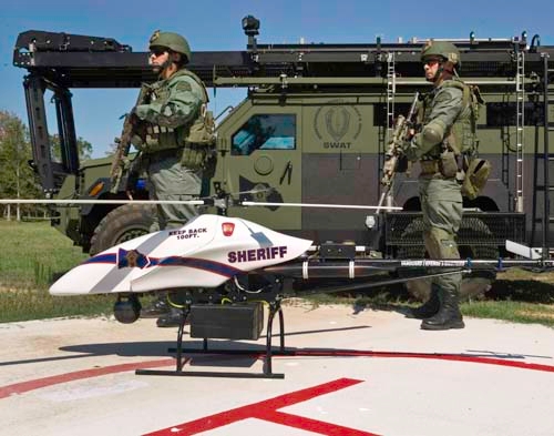 One helicopter drone, the ShadowHawk, purchased by the Montgomery County sheriff's department in Texas from Vanguard Defense Industries through a $300,000 Homeland Security grant, can be armed with a shotgun and grenade launcher.