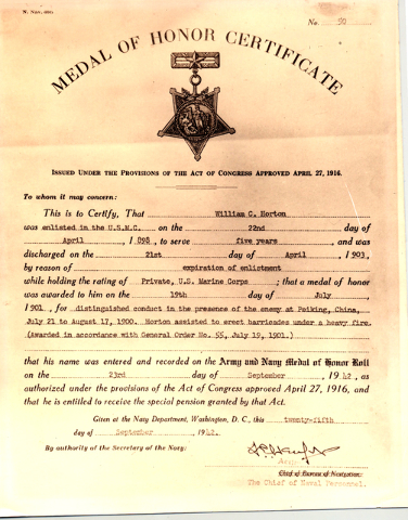 Like the other Marines who received the nation’s highest award for valor in the Boxer Rebellion — 33 in all — Horton went above and beyond the call of duty to take the American flag to the U.S. Embassy compound and keep it flying high 115 years ago.
