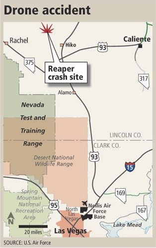 Base officials said the MQ-9 Reaper, which wasn't armed with live munitions, crashed about 7:15 p.m. Wednesday in remote, mountainous terrain about 15 miles northwest of Hiko near the Nevada Test and Training Range.