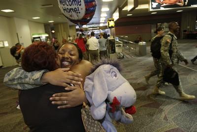 With open arms and a broad smile on her face, Carol ran to embrace Misty, who walked into the baggage area at 7:15 p.m. with a half dozen other soldiers. Their families cheered.