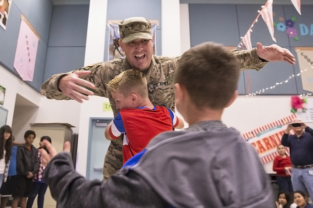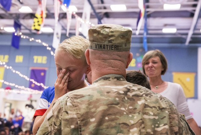 Beau Vinatieri had arrived in Las Vegas on Wednesday with about 150 other soldiers from the Nevada Army National Guard’s 17th Sustainment Brigade. The soldiers were bused to the Las Vegas Readiness Center to meet their families after landing at McCarran International Airport on a flight from Texas.