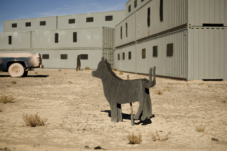 Black, plywood silhouettes of men, women, children and at least one dog stood between bombed-out trucks and buildings made of Sea-Land shipping containers stacked two and three stories high.