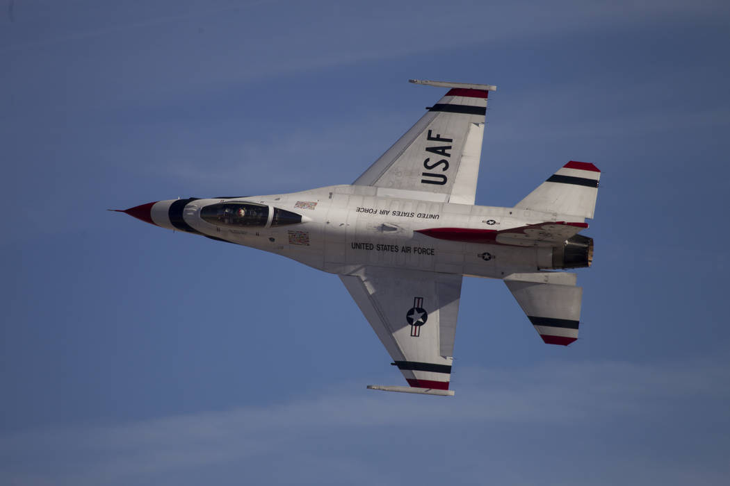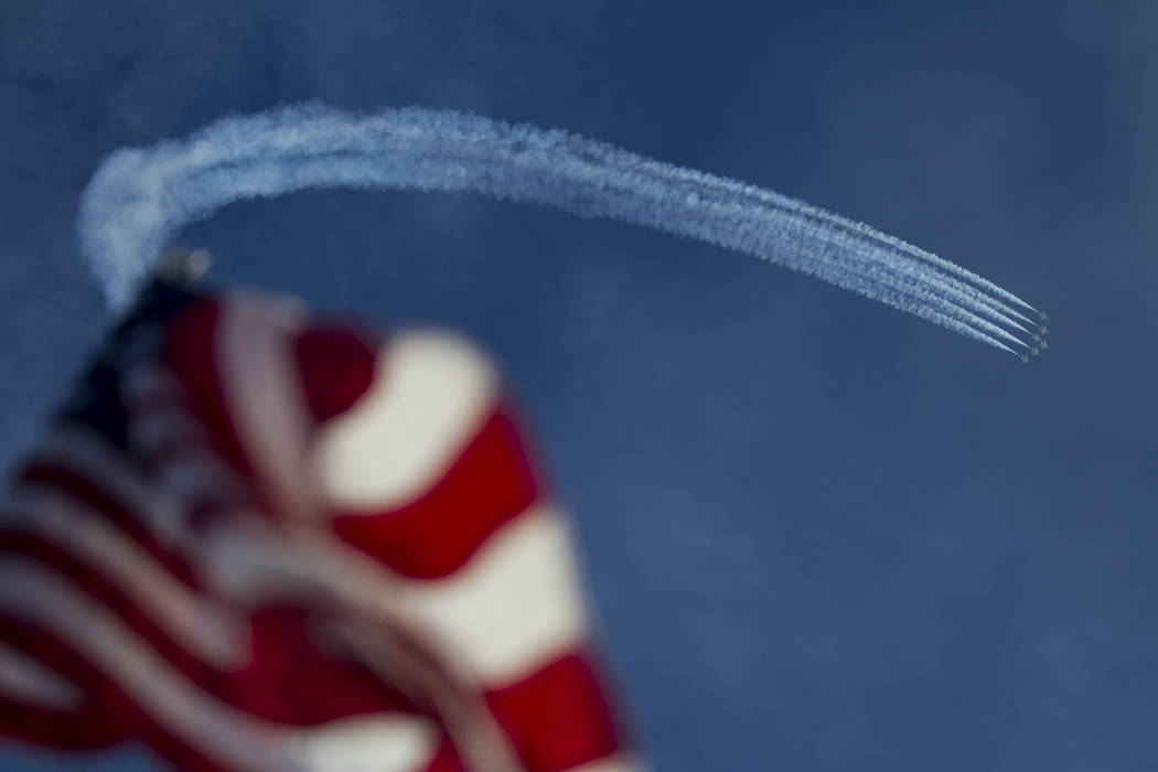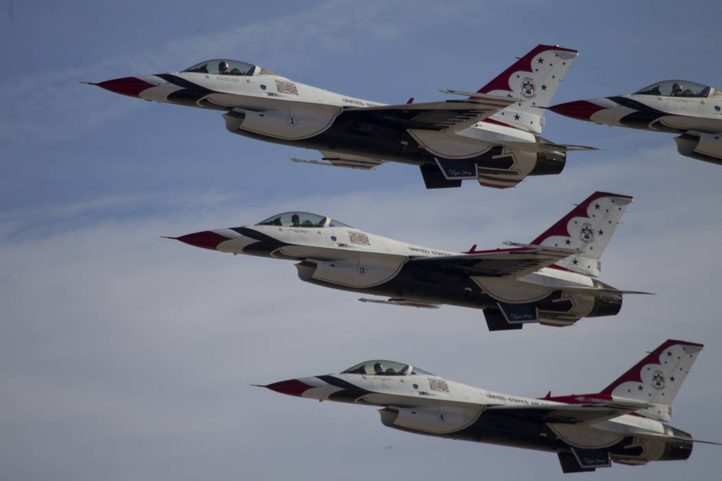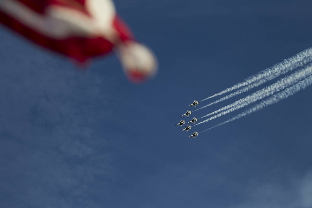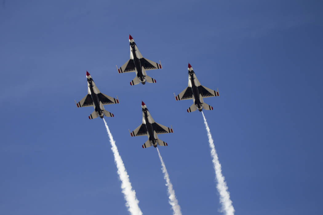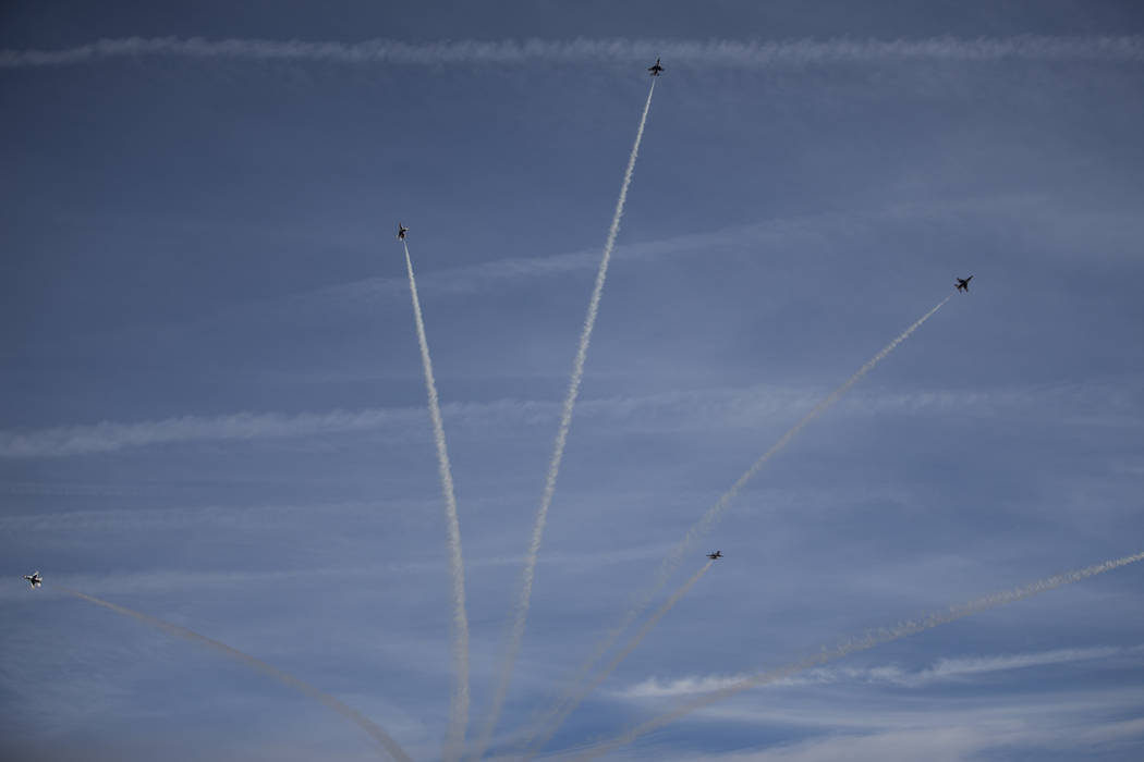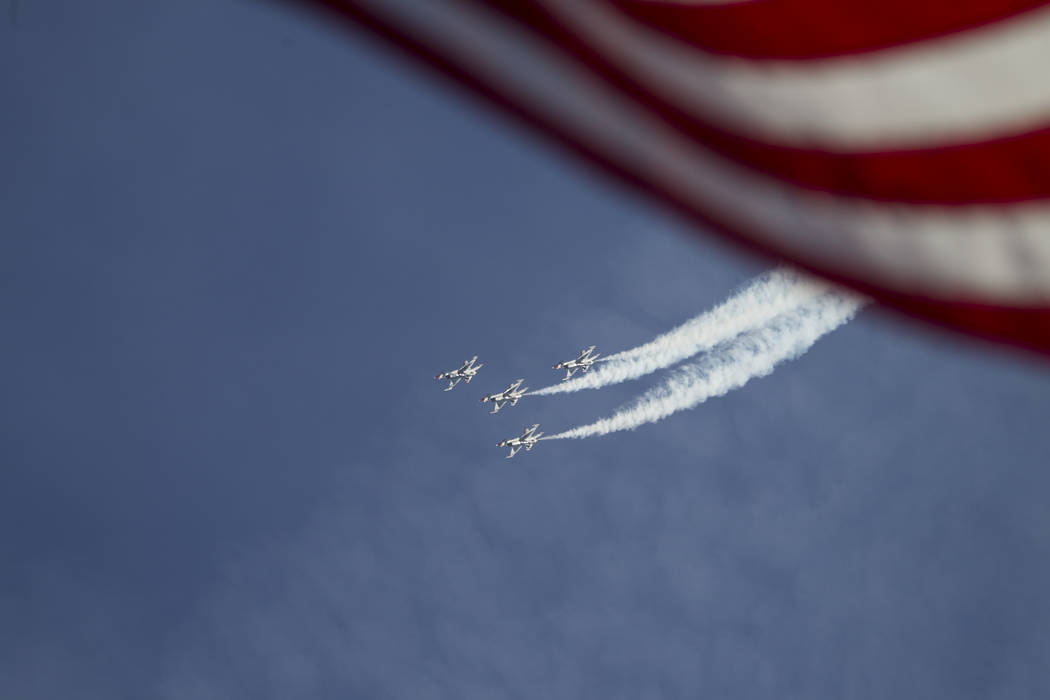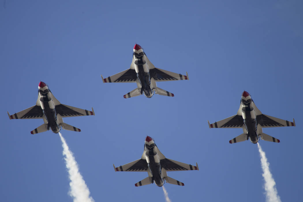 The Thunderbirds, the Air Force’s elite demonstration team, took to the skies after 2 p.m., pulling families away from the displays to catch the smoke-filled, acrobatics performance.