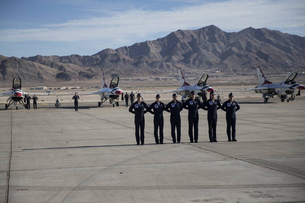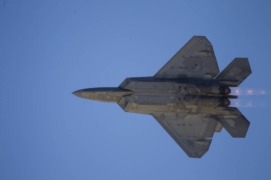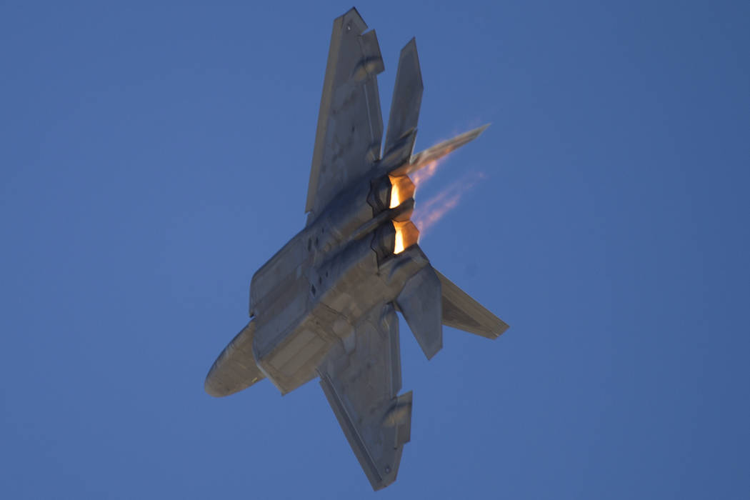 F-15 fighter jets zoomed over Nellis Air Force Base at supersonic speed in pursuit of enemy planes in a mock battle on Saturday afternoon.