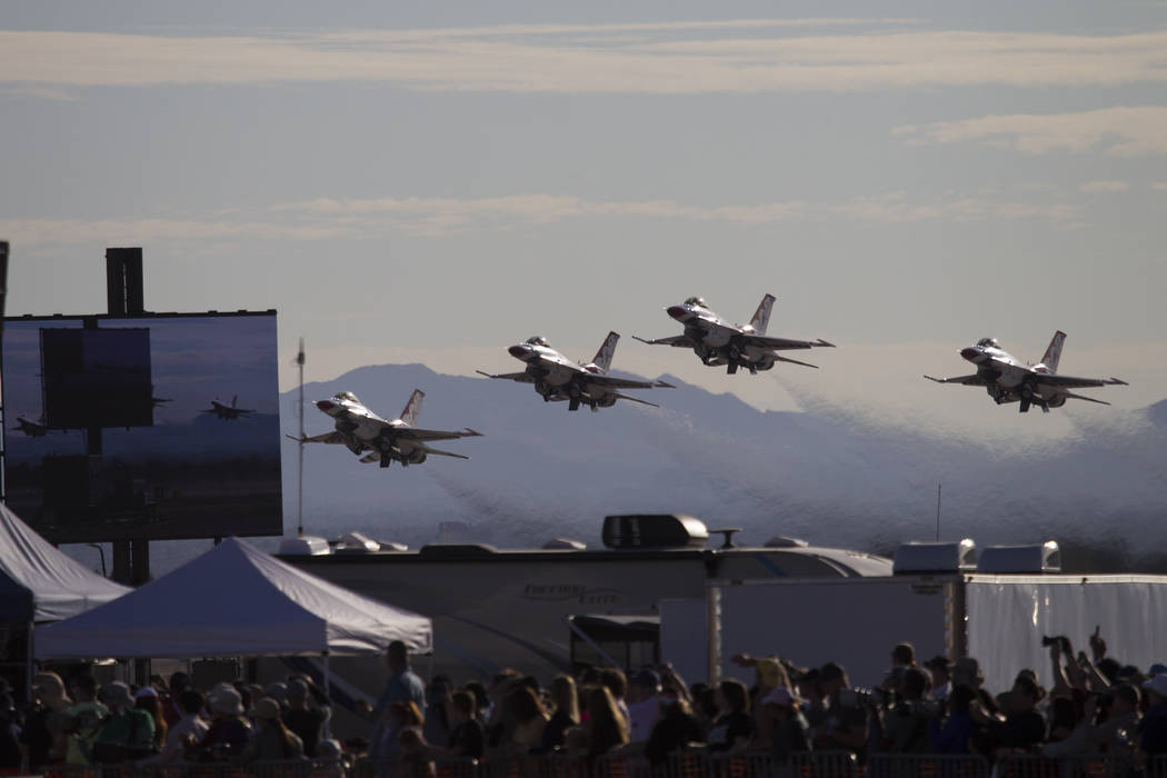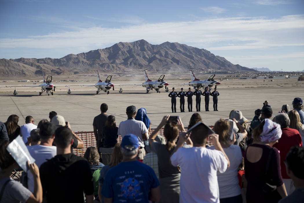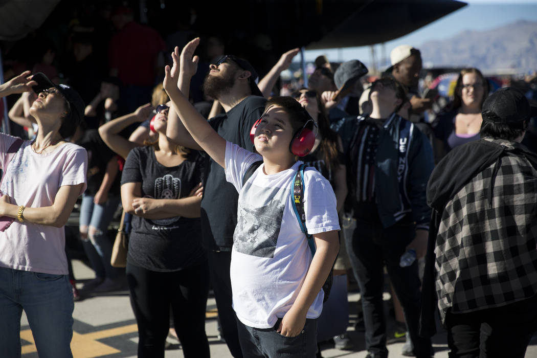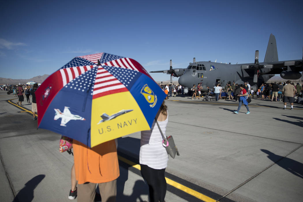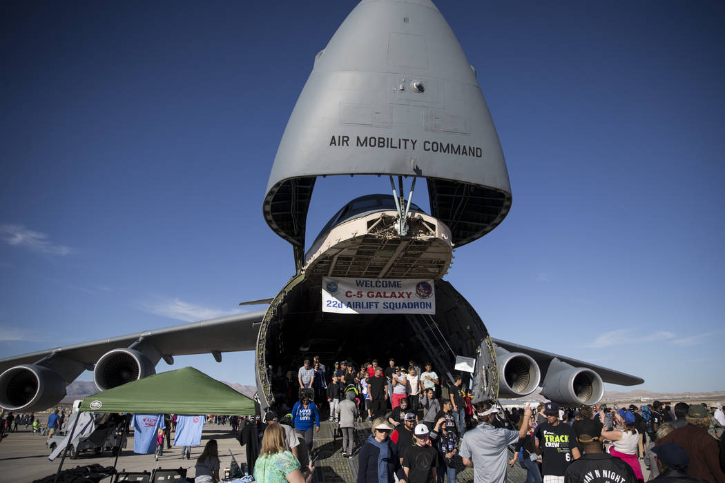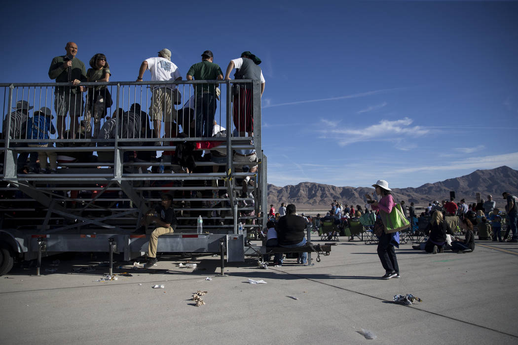 Thousands of visitors came to the show early to get the best spots. Cars lined up for about a mile to park at Las Vegas Speedway, where buses board waited to scoot people to Nellis.