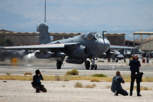 An EA-6B Prowler from Marine Corps Air Station, Cherry Point, N.C., gets ready to launch during a Red Flag exercise at Nellis Air Force Base in Las Vegas Tuesday, July 21, 2015. (Erik Verduzco/Las Vegas Review-Journal) Follow Erik Verduzco on Twitter