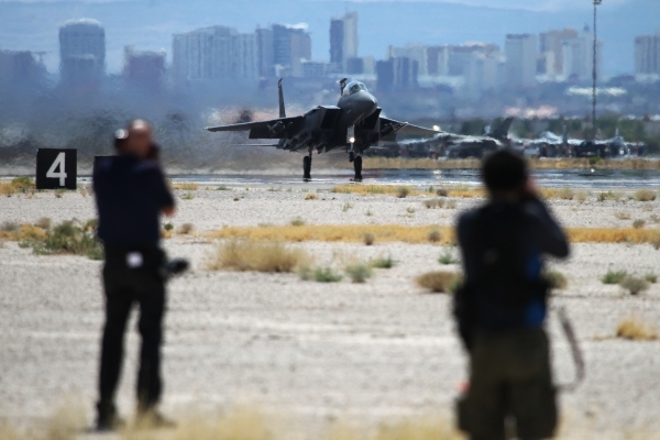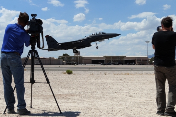 Photographers shoot a F-15E Strike Eagle from Mountain Home Air Force Base, Idaho, as it takes off during a Red Flag exercise at Nellis Air Force Base in Las Vegas Tuesday, July 21, 2015. (Erik Verduzco/Las Vegas Review-Journal) Follow Erik Verduzco on Twitter