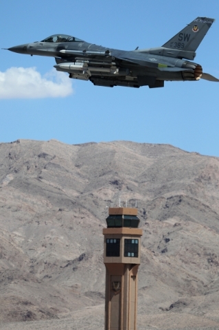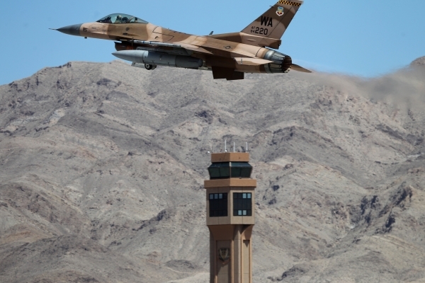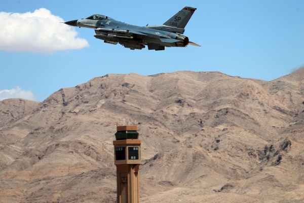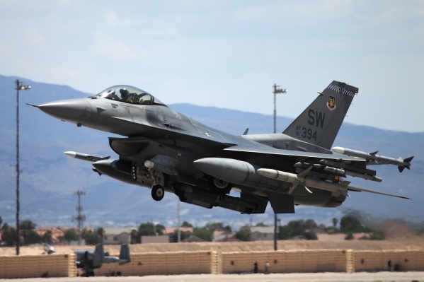 An F-16 Fighting Falcon from the 64th Aggressor Squadron at Nellis Air Force Base, heads off during a Red Flag exercise at Nellis Air Force Base in Las Vegas Tuesday, July 21, 2015. (Erik Verduzco/Las Vegas Review-Journal) Follow Erik Verduzco on Twitter