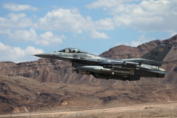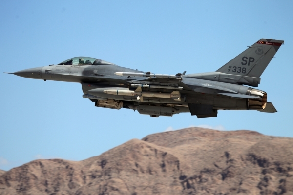An F-16 Fighting Falcon from Shaw Air Force Base, S.C., heads off for a Red Flag exercise at Nellis Air Force Base in Las Vegas Tuesday, July 21, 2015. (Erik Verduzco/Las Vegas Review-Journal) Follow Erik Verduzco on Twitter