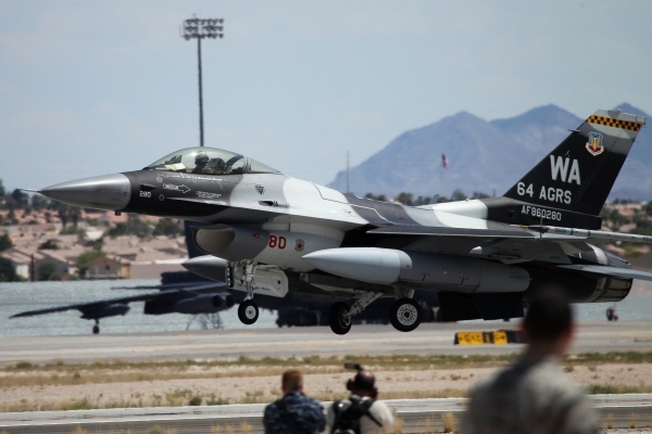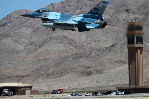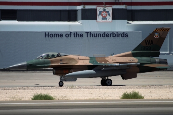 An F-16 Fighting Falcon from the 64th Aggressor Squadron at Nellis Air Force Base, gets ready to launch during a Red Flag exercise at Nellis Air Force Base in Las Vegas Tuesday, July 21, 2015. (Erik Verduzco/Las Vegas Review-Journal) Follow Erik Verduzco on Twitter
