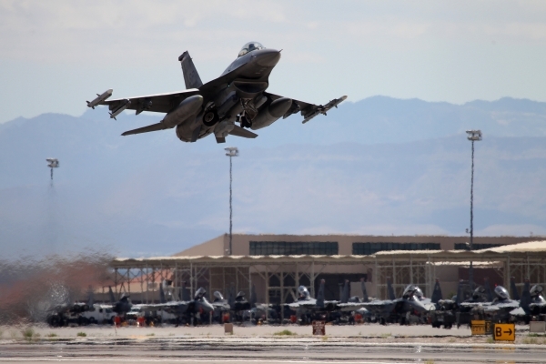 An F-16 Fighting Falcon from the 64th Aggressor Squadron at Nellis Air Force Base, takes off during a Red Flag exercise at Nellis Air Force Base in Las Vegas Tuesday, July 21, 2015. (Erik Verduzco/Las Vegas Review-Journal) Follow Erik Verduzco on Twitter