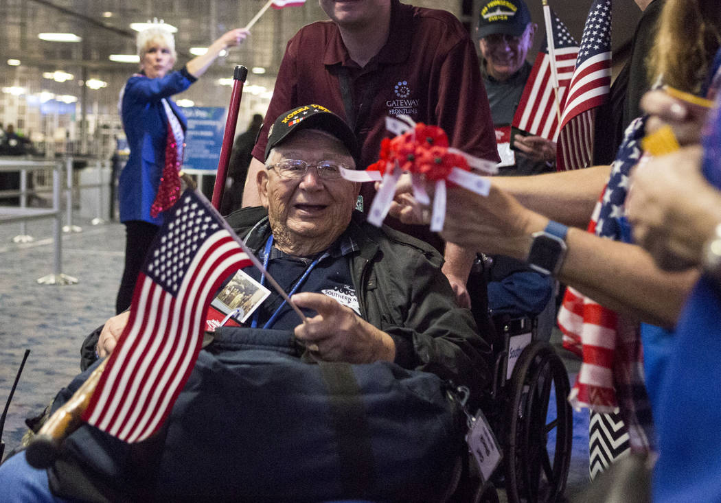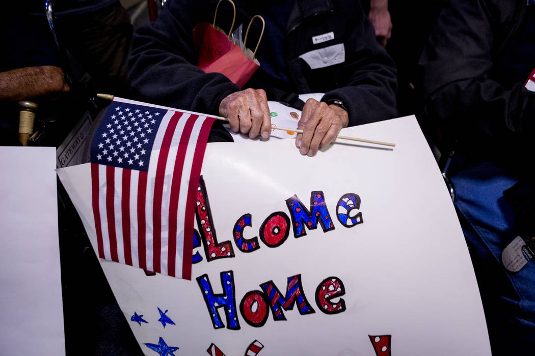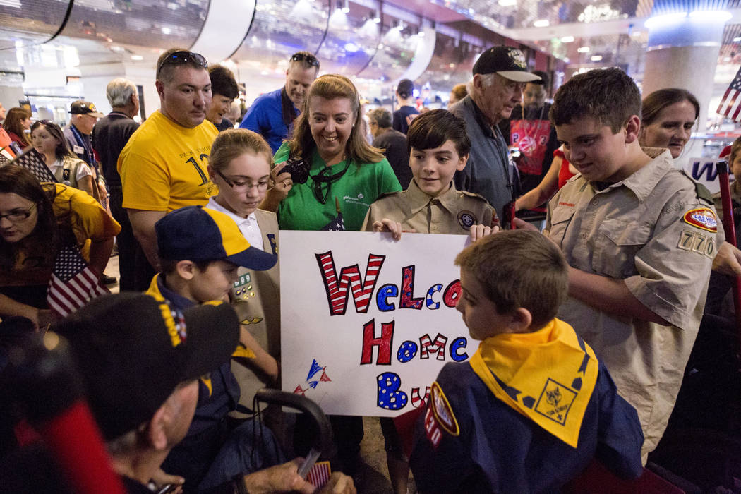 Upon their return to McCarran on Sunday, the veterans were greeted by dozens of well-wishers waving American flags and carrying handmade signs. Among the well-wishers were many members of local scouting organizations.