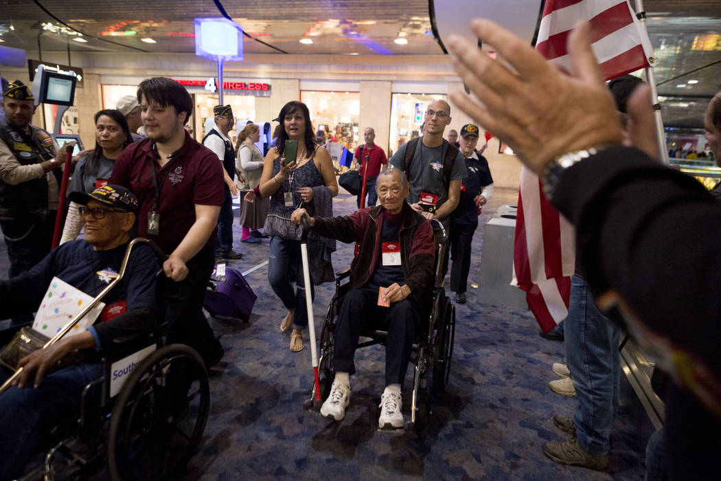 World War II and Korean War Veterans are greeted at McCarran International Airport after returning to Las Vegas from Washington, D.C. from an Honor Flight Southern Nevada, Sunday, Oct. 29, 2017. 24 WWII Veterans and five Korean War Veterans for a three-day visit to see several of the war monuments and memorials that stand in their honor. Elizabeth Brumley Las Vegas Review-Journal @EliPagePhoto