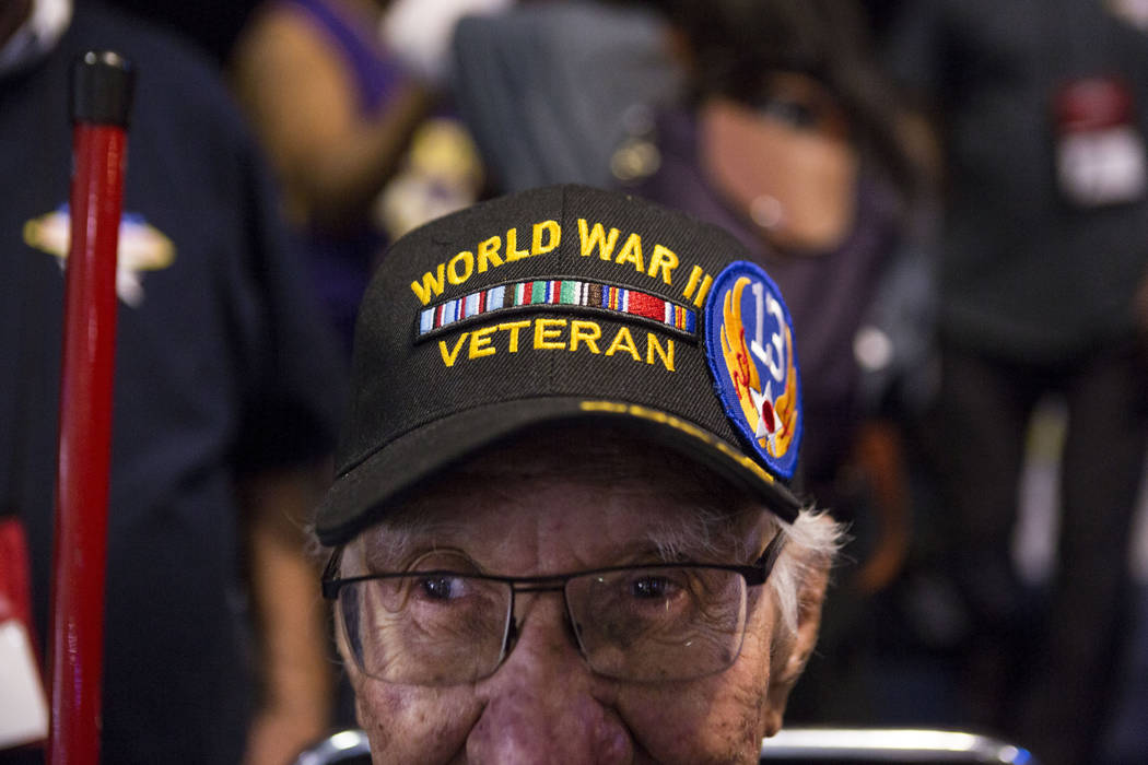 World War II Veteran Joe Pena is greeted at McCarran International Airport after returning to Las Vegas from Washington, D.C. from an Honor Flight Southern Nevada, Sunday, Oct. 29, 2017. Pena was accompanied with 23 other WWII Veterans and five Korean War Veterans for a three-day visit to see several of the war monuments and memorials that stand in their honor. Elizabeth Brumley Las Vegas Review-Journal @EliPagePhoto