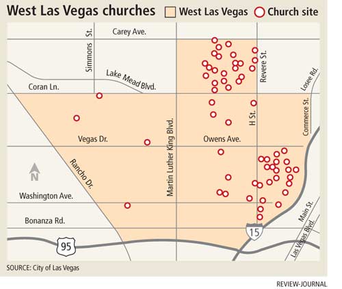 A city survey recorded 46 religious facilities in the area bounded by Rancho Drive, Lake Mead Boulevard, Interstate 15 and U.S. Highway 95, most of them packed into the area east of Martin Luther King Drive. Religious uses take up 2.9 percent of the land area in the district, compared to 0.6 percent citywide.