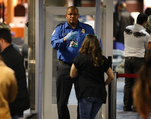 Jeremy Martin and Alberto Ortiz flew in from Wichita, Kan., where they had observed no protesters. When asked whether they would have a problem using McCarran's scanners, each said no.