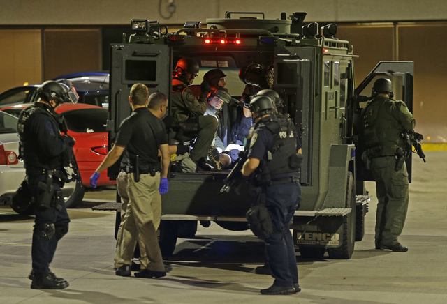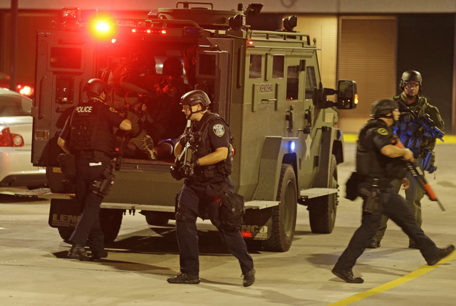 Some two dozen officers in riot gear confronted a group who were throwing rocks and other objects at police near where the black man was fatally shot a day earlier. Police moved in to try to disperse the crowd and warned of arrests. Police took the injured person to a hospital in an armored vehicle.