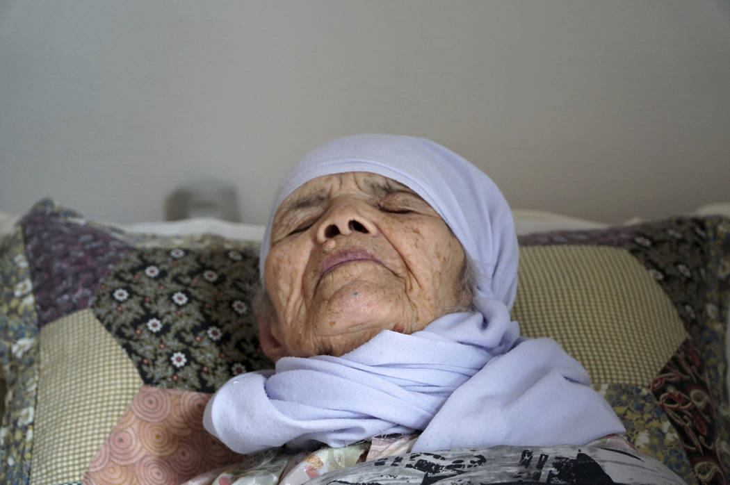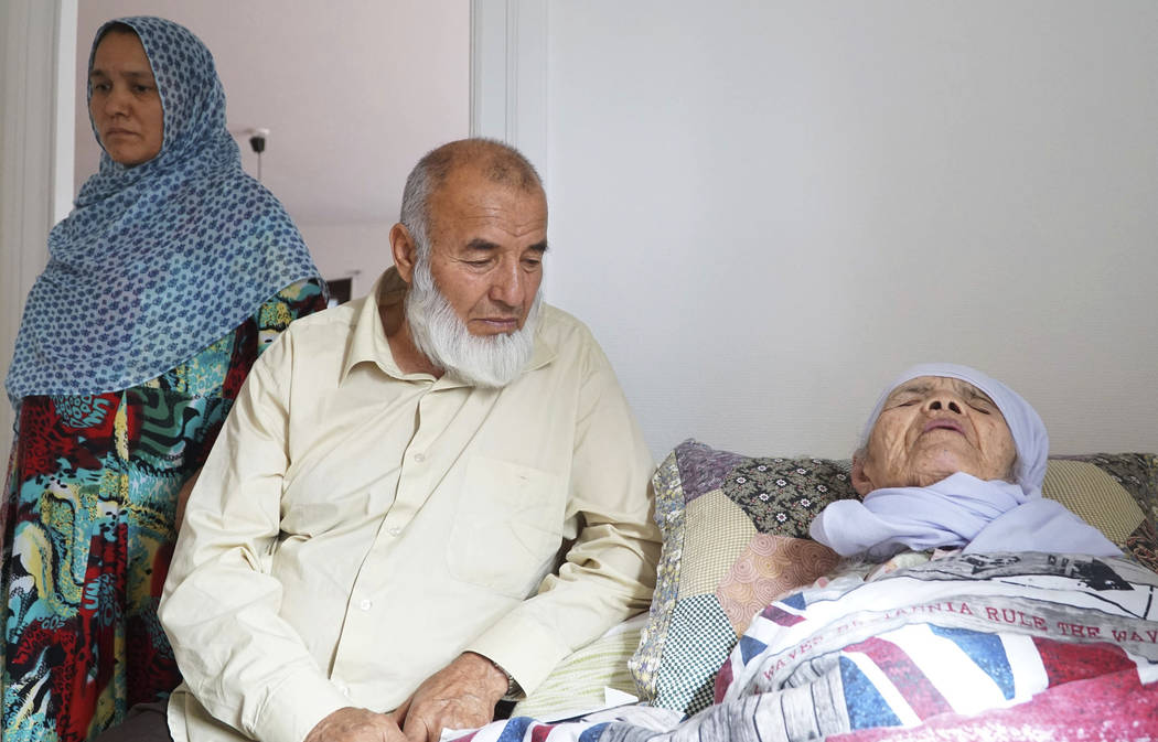 In the Uzbeki home, Bibihal’s daughter-in-law gently readjusts the elderly woman’s veil as Mohammed Uzbeki watches over her.