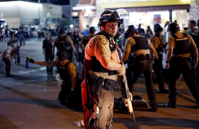 Adding to the tension, four white men carrying military-style rifles and sidearms, who said they are part of a group called "Oath Keepers," patrolled Ferguson's streets.