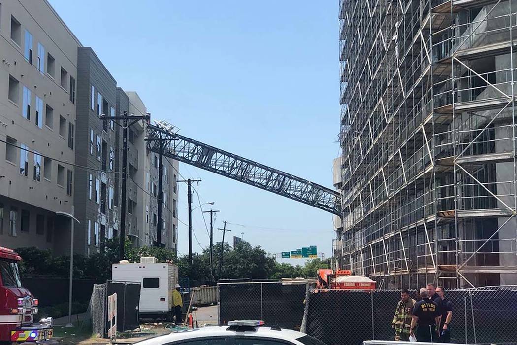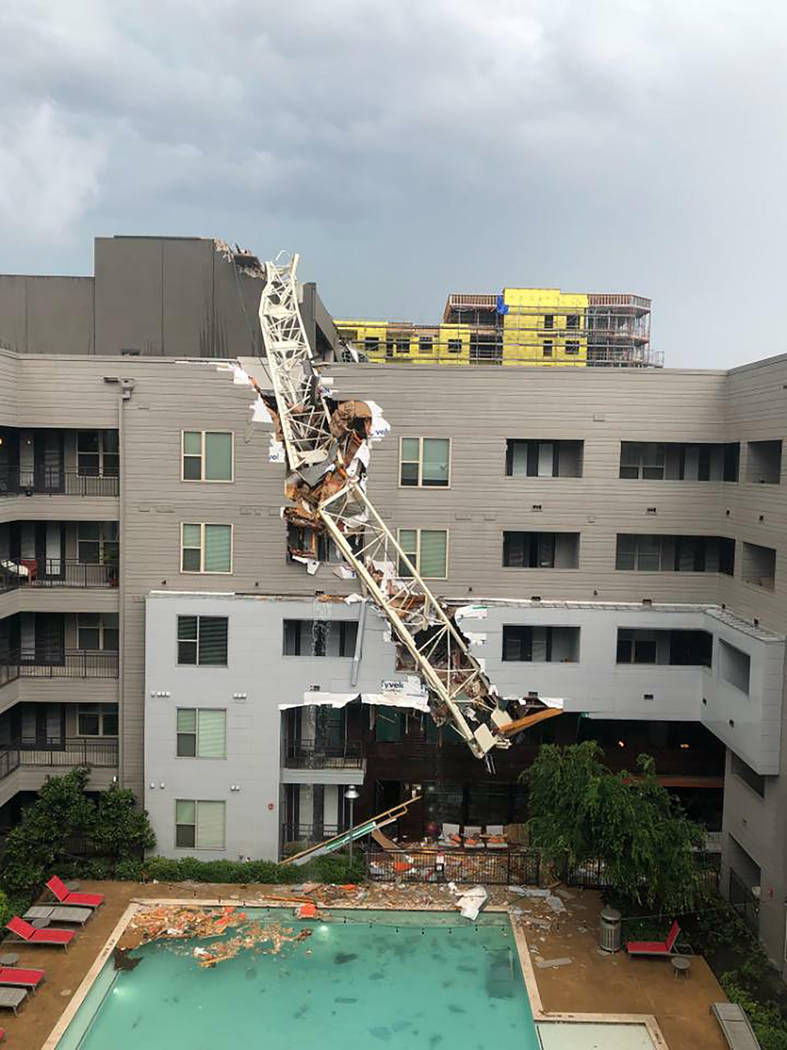 The crane fell around 2 p.m. as storms ripped across parts of Oklahoma and Texas, bringing high winds, heavy rain and hail that flooded streets and caused power outages. Wind gusts up to 71 mph were measured at Dallas Love Field airport, said National Weather Service meteorologist Patricia Sanchez.