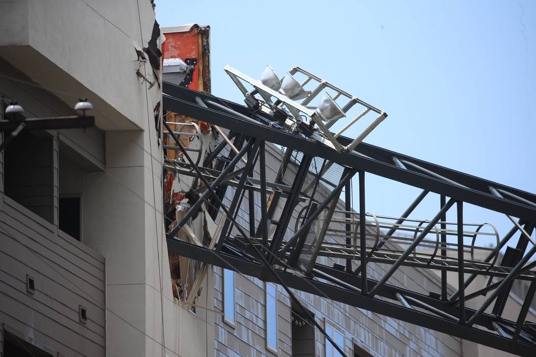 At the Elan City Lights building damaged by the crane, fire crews were escorting evacuated residents back inside to retrieve their possessions, as city workers and Occupational Safety and Health Administration officials ponder how to remove the crane embedded in the structure’s east side.