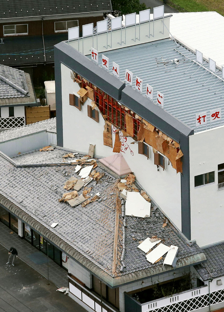 At least two houses collapsed, and television footage showed roof tiles knocked loose, wall fragments from a sake brewery fallen to the ground, and wine bottles and food items scattered on a store floor. Japan’s public broadcaster NHK said a woman cooking in a restaurant was taken to a hospital after she was splashed with oil.