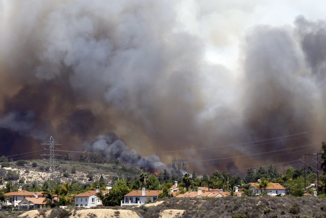CARLSBAD, Calif. — Nine wildfires covering more than 14 square miles scorched San Diego County on Wednesday, forcing thousands to flee their homes and prompting the closures of a college campus and Legoland California. No major injuries were reported.