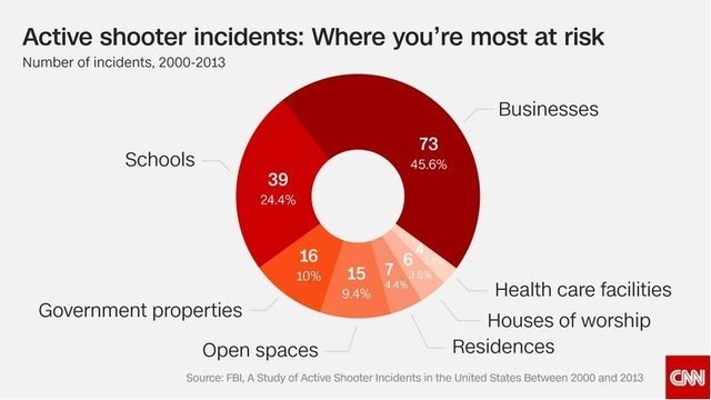 From 2000 to 2007, the United States saw an average of 7.4 active shooter events per year. The number is 16.4 for 2008 to 2013.