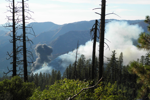 The fire had broken out about 90 minutes earlier Tuesday near Route 140, which leads into the heart of the park. It had grown to about 130 acres by Tuesday evening and forced the evacuation of several dozen homes near the community of Foresta.
