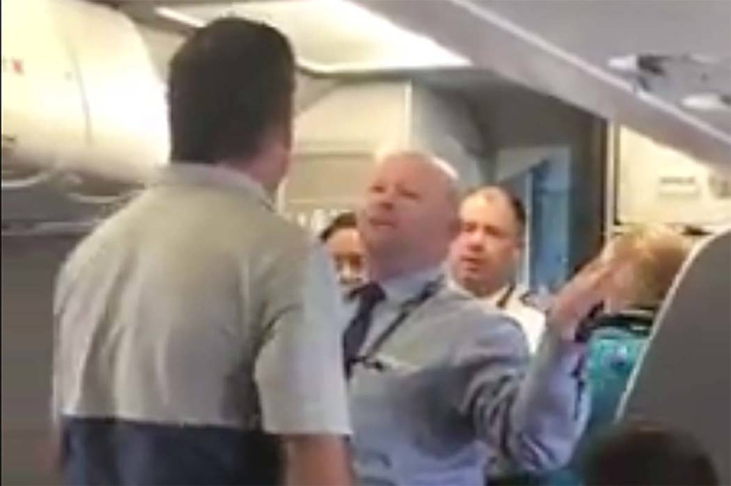 The two then confront each other in the aisle of the plane and the employee can be heard challenging the passenger to hit him. The passenger eventually returns to his seat and the flight attendant leaves the plane.