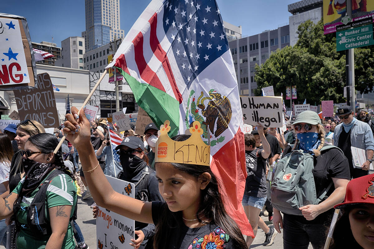 In some places, organizers handed out little American flags while others flew their flags upside down, a sign of distress. Mexican flags, which have become a fixture of the Los Angeles protests against immigration raids, also made an appearance at some demonstrations Saturday.