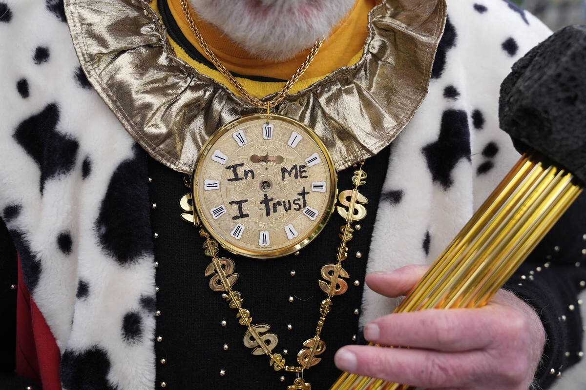 A woman wearing a foam Statue of Liberty crown brought a speaker system and led an anti-Trump sing-along, changing the words “young man” in the song “Y.M.C.A.” to “con man.”