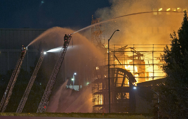 FILE – In this Dec. 8, 2014 file photo, Los Angeles firefighters battle a fire in the seven-story Da Vinci apartment complex under construction in downtown Los Angeles. Investigators have determined that arson caused the massive fire, causing an estimated $20 million to $30 million in damage. The intense heat also melted a freeway sign and cracked or shattered hundreds of windows in nearby office buildings. The Fire Department announced Thursday, Dec. 18, 2014, that the blaze was deliberately set. (AP Photo/Damian Dovarganes, File)