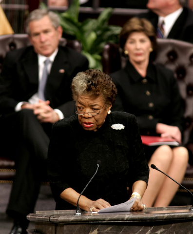 The world was watching in 1993 when she read her cautiously hopeful “On the Pulse of the Morning” at President Bill Clinton’s first inauguration. Her confident performance openly delighted Clinton and made publishing history by making a poem a best-seller, if not a critical favorite. For President George W. Bush, she read another poem, “Amazing Peace,” at the 2005 Christmas tree lighting ceremony at the White House. Presidents honored her in return with a National Medal of Arts and the Presidential Medal of Freedom, the country’s highest civilian honor. In 2013, she received an honorary National Book Award.