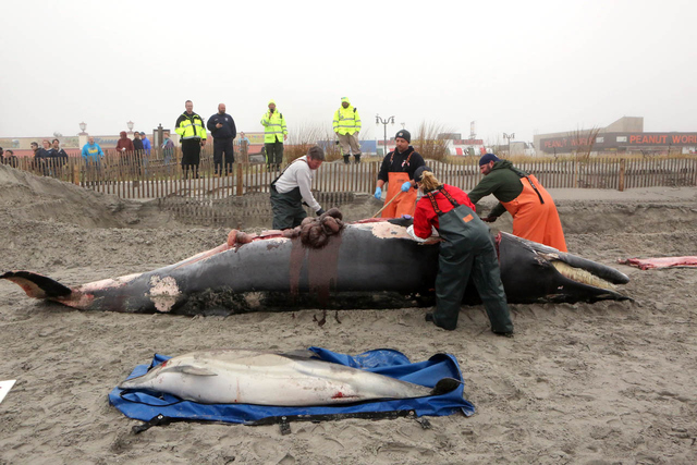 Bob Schoelkopf of the Marine Mammal Stranding Center says the whale appeared to have been dead for several days and washed up during a strong storm. It had no sign of trauma. A state pathologist will try to determine the cause of death.