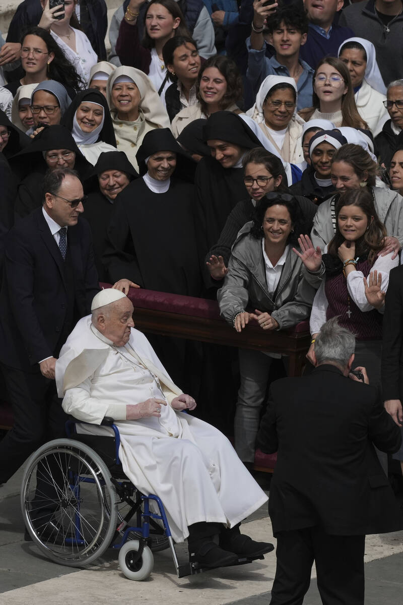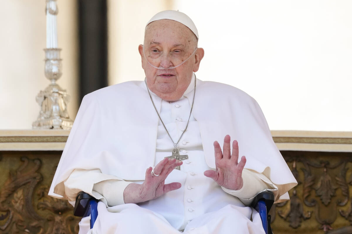 March 23, 2025: Is released from the hospital after 38 days of treatment but looked weak and frail earlier that day when appearing on a balcony to greet the crowd below.