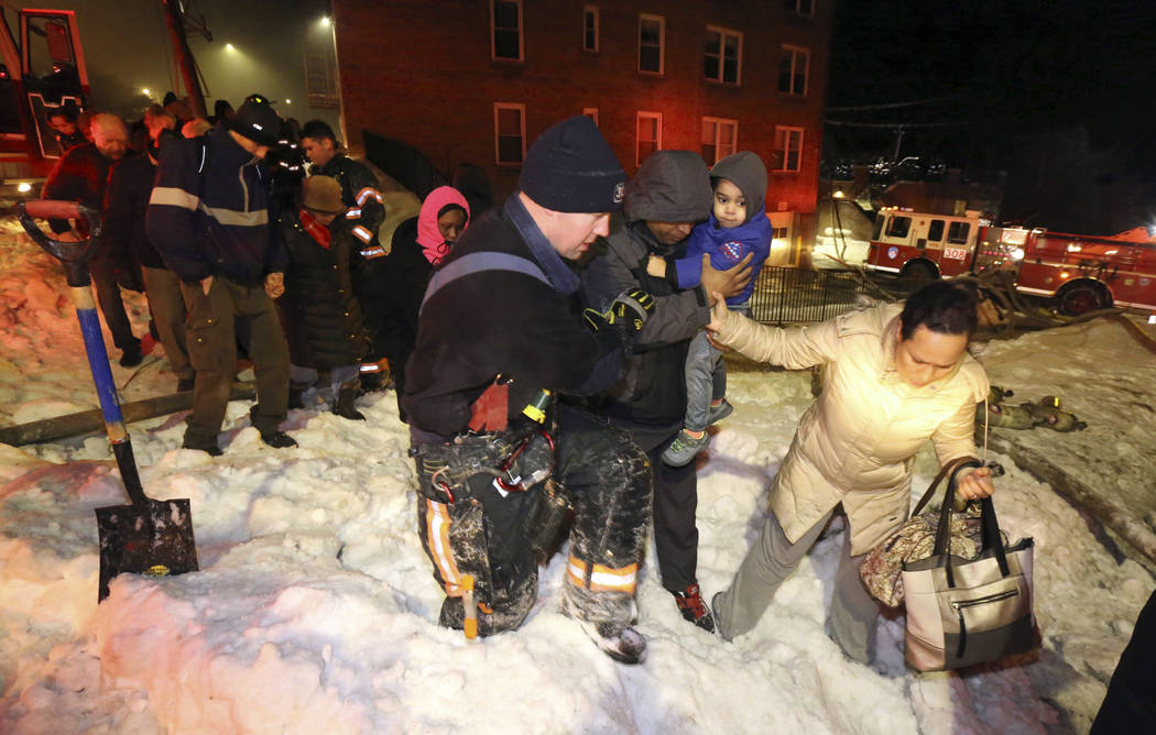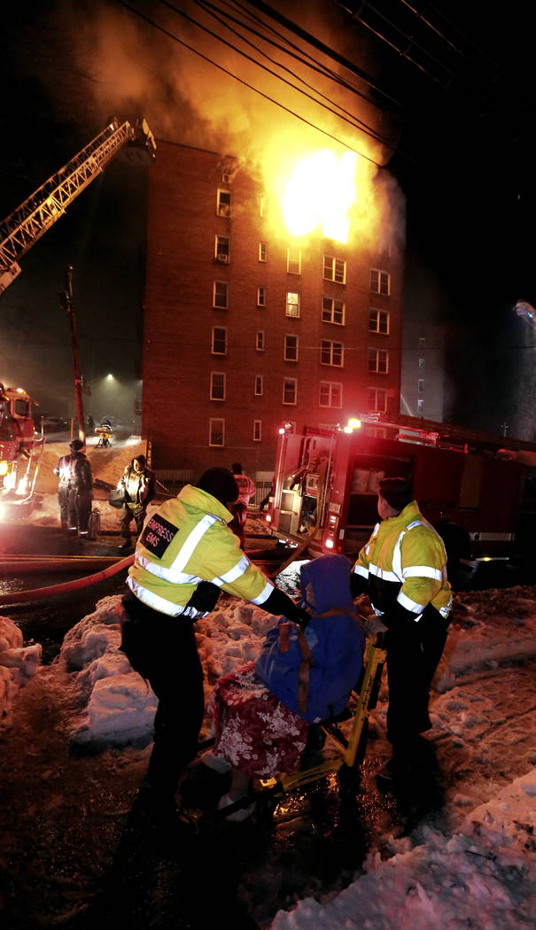 Photos show rescuers helping bundled-up residents walk across snowbanks on a slippery hill as flames shoot out of the building.