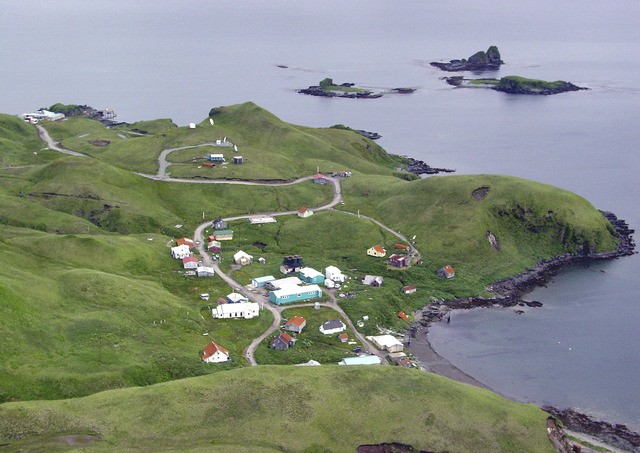 Atka residents were displaced during the war, relocating to Southeast Alaska so the U.S. government could demolish the village to prevent the Japanese from seizing it as they had other Aleutian communities. After the war, the U.S. Navy rebuilt the community and residents returned. Today, the community is a cluster of solidly built utilitarian buildings scattered over rolling hills that turned emerald green in warmer months.